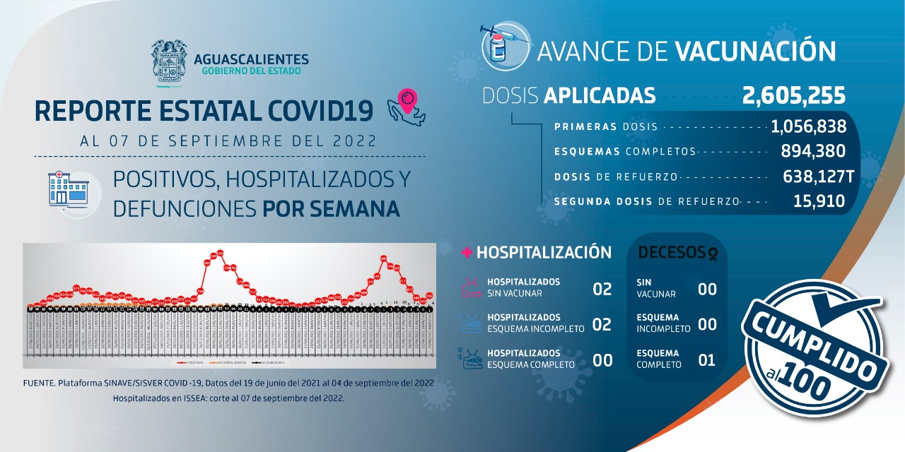 La Secretaría de Salud de Aguascalientes, presentó el Reporte Técnico Semanal Covid-19, correspondiente del 29 de agosto al 4 de septiembre y a través del cual se muestra que en la entidad se han aplicado 2 millones 605 mil dosis de vacunas aplicadas a las