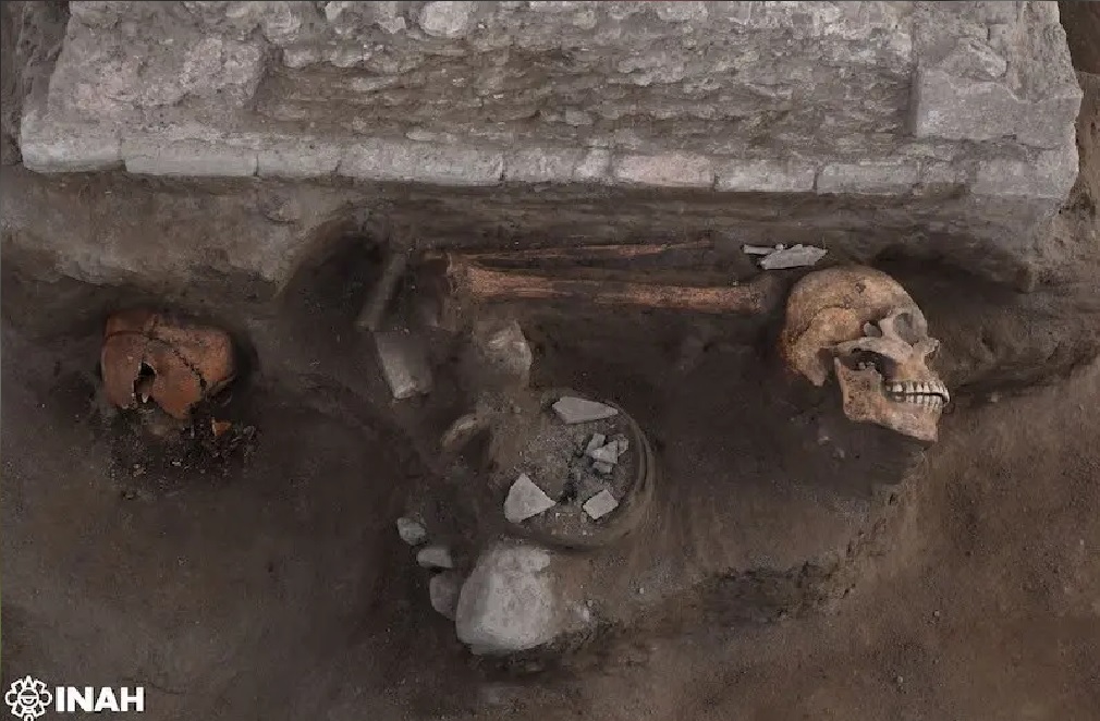 Uno de los elementos más relevantes del hallazgo es la presencia de ofrendas humanas. En tres de los lados del nivel inferior se encontraron restos óseos, entre ellos cuatro cráneos y huesos largos, posiblemente fémures. En el arranque del altar se localizaron dos cráneos —uno orientado hacia la parte superior y otro hacia el suroeste—, mientras que en niveles más profundos aparecieron otras osamentas incompletas.