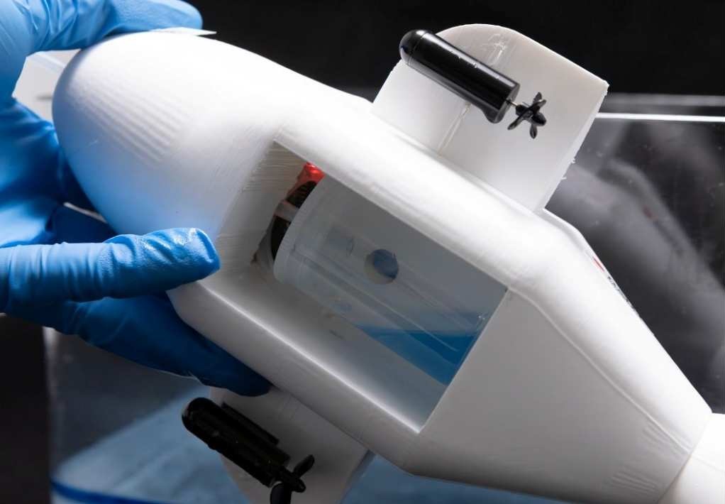 Un robot acuático del tamaño de una zapatilla llamado «Electronic Dolphin». Aspira petróleo directamente del agua.