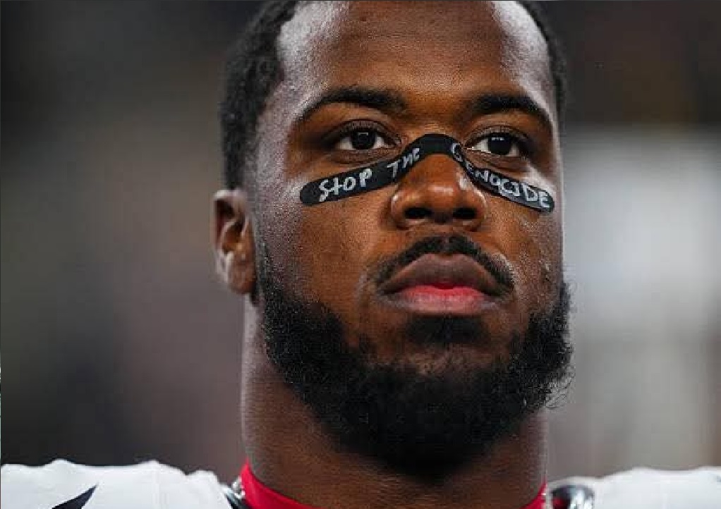 “Alto al genocidio”, es lo que se podía leer sobre la nariz del apoyador y que constantemente captaron las cámaras televisivas, algo que no fue del agradado de la NFL, por lo que advirtió al apoyador de los Texanos para que cesara con sus protestas.