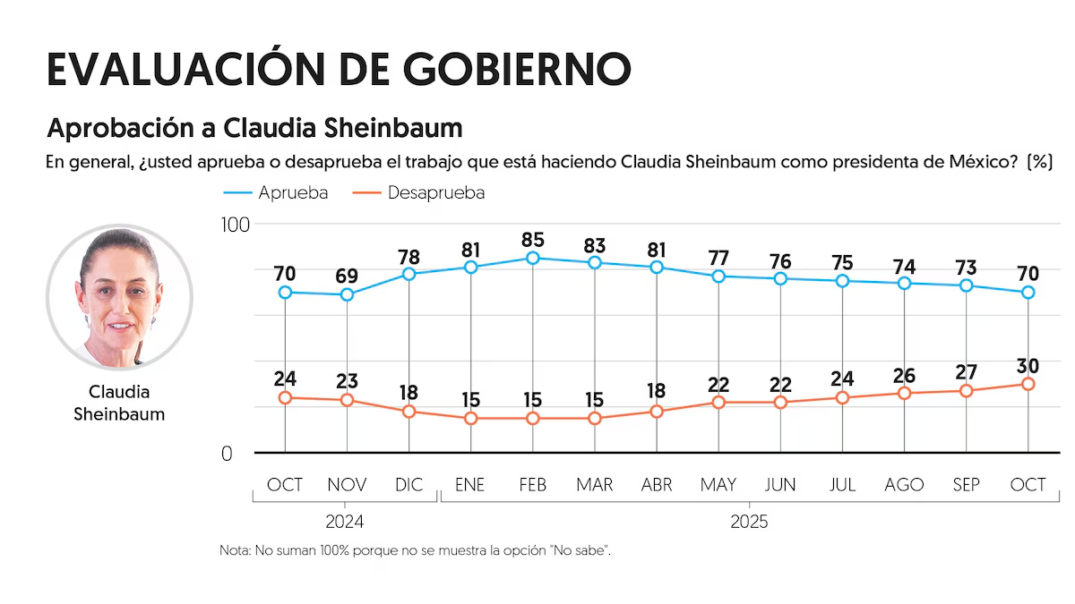 En medio de un mes marcado por lluvias intensas y graves inundaciones en distintas regiones del país, la presidenta Claudia Sheinbaum conserva un nivel de aprobación del 70%, de acuerdo con la más reciente encuesta nacional de El Financiero. La desaprobación alcanza el 30%, el punto más alto en lo que va de su administración.